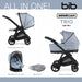 A complete travel system, which includes the BIB chassis with basket, a carrycot with hood; apron and reversible pushchair seat, rain cover, mattress, changing bag and car seat.